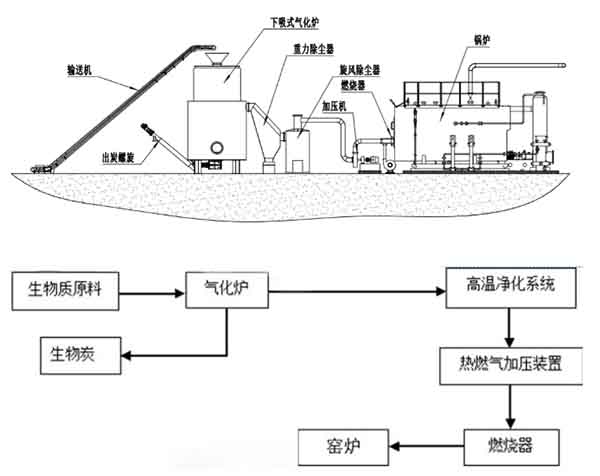 生物質(zhì)原料通過(guò)螺旋加料機(jī)加入氣化爐,而氣化所需要的空氣通過(guò)鼓風(fēng)機(jī)從氣化爐底部的配風(fēng)裝置進(jìn)入氣化爐內(nèi),生物質(zhì)原料在缺氧狀態(tài)下燃燒生成可燃?xì)怏w和焦油,部分焦油在高溫下發(fā)生二次裂解為不凝性可燃?xì)怏w。熱分解析出的焦碳與燃燒產(chǎn)生的水蒸汽和二氧化碳進(jìn)行還原反應(yīng),產(chǎn)生氫氣、一氧化碳等可燃?xì)怏w,在氣體上升過(guò)程中,繼續(xù)進(jìn)行還原和熱解反應(yīng)。氣態(tài)焦油、氣體連同灰渣顆粒、焦碳從氣化爐上部流出,進(jìn)入隨后的燃?xì)鈨艋蛛x裝置旋風(fēng)除塵器,進(jìn)入旋風(fēng)除塵器絕大部分灰渣通過(guò)旋風(fēng)除塵器從燃?xì)庵蟹蛛x出來(lái)?;以ㄟ^(guò)除灰裝置、灰輸送裝置輸送到合適的地點(diǎn)。旋風(fēng)除塵器分離出來(lái)的燃?xì)膺M(jìn)入燃?xì)饧訅貉b置,被壓送到鍋爐燃燒機(jī)完全燃燒。